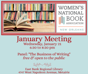 Join us for our next monthly meeting WED, JAN 21, for “The Business of Writing” with panelists Marie Breaux, intellectual property attorney; Jim Schoen, Fidelity business banker; and Gene Meneray, co-founder of the Ella Project, which provides pro bono advocacy and assistance to artists, musicians, and nonprofits.